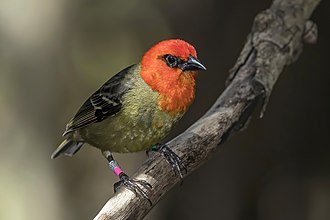 ![]() Mauritius fody (Foudia rubra) male, Île aux Aigrettes, Mauritius. An endangered bird, endemic to Mauritius. A wild bird that has been ringed as part of a successful conservation plan. Change image |