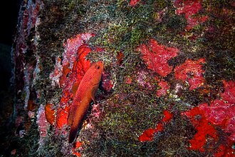 English : Coney (Cephalopholis fulva) camouflaged on a rock, Fernando de Noronha Marine National Park, Pernambuco, Brazil.
